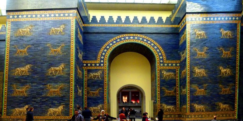 - دروازه ایشتر شهر بابِل: نمایشگاه خارقالعادهی دیگر، دروازهی ایشتر و خیابان بابل است که در زمان پادشاه نبودکدنصر دوم در قرن ششم قبل از میلاد ساخته شده اند. این دروازه با کاشیهای مینا به رنگ آبی و نقش برجسته حیوانات تزئین شده است که خدایان بابلی را به تصویر کشیده اند. طول خیابان 250 متر است و دروازه در انتهای خیابان بازسازی شده است.