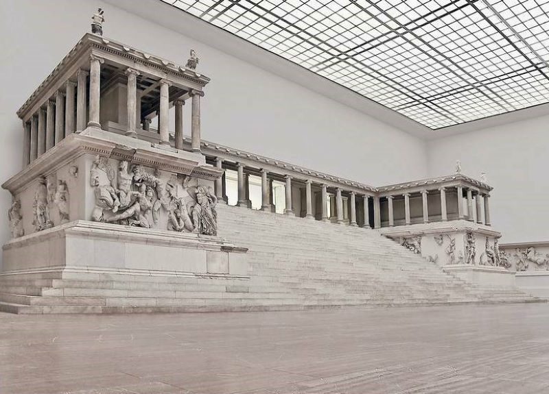 - محراب پرگامون: محور اصلی موزه محراب عظیم پرگامون است که در قرن دوم پیش از میلاد ساخته شده است. سازه مذکور در سال ۱۸۷۶ توسط باستانشناسی به نام کارل اومان کشف و در سال ۱۹۰۳ به برلین منتقل گردید. موزائیککاری بزرگ روی نمای این ساختمان به طول ۹۱ و ارتفاع ۲۰۴ متر صحنه نبرد وحشتناکی را میان خدایان و هیولاهای کُهن نشان میدهد که قدرت خدایان را به چالش میکشند. در این صحنههای پرهیاهو بیش از صد شکل و شمایل بزرگتر از قامت انسان با یکدیگر درآویختهاند.